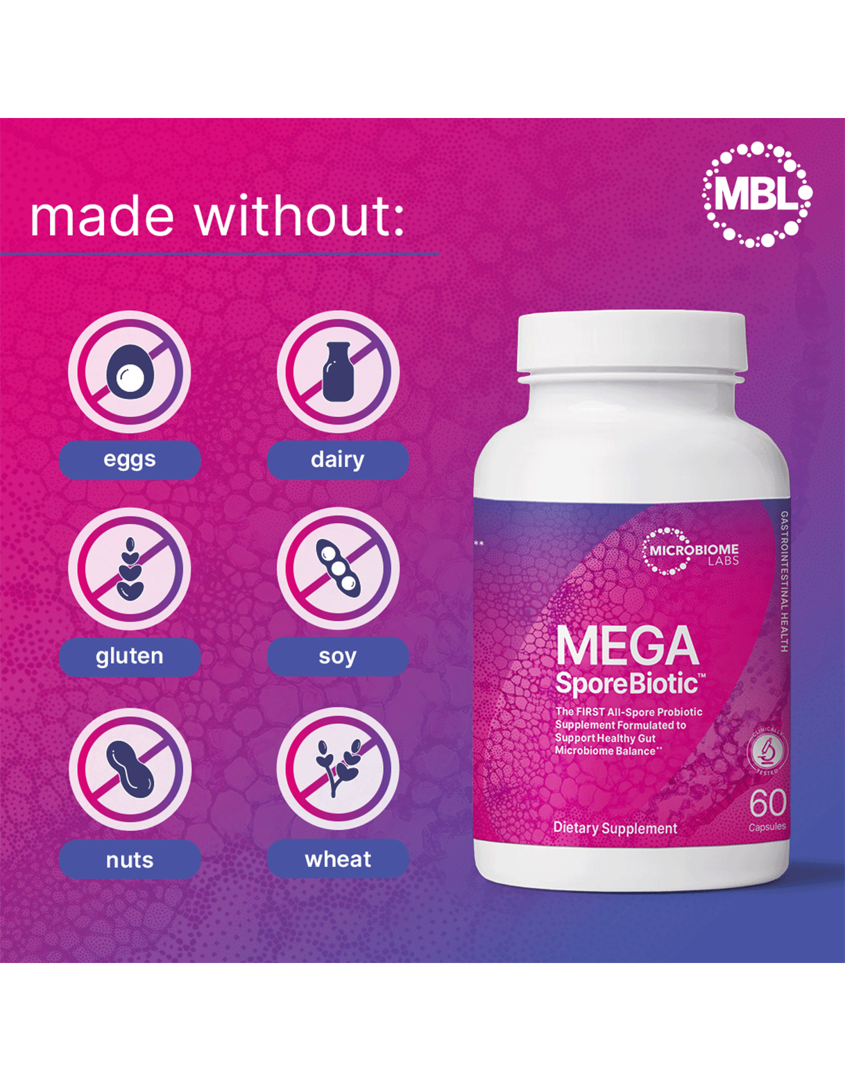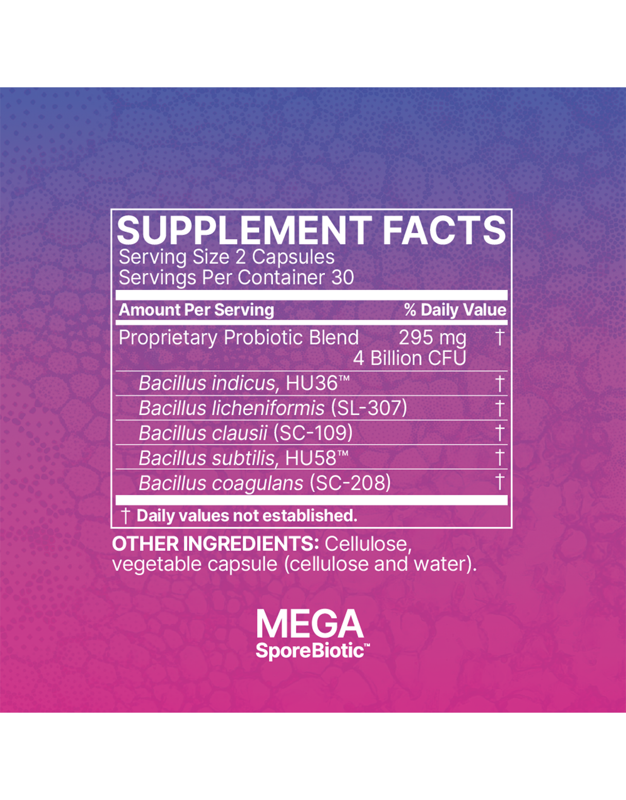 MegaSporeBiotic is a probiotic blend of 5 Bacillus spores that have been shown to maintain healthy gut barrier and immune function. The bi-phasic life cycle of the Bacillus spores allows them to remain dormant in harsh environments until they reach more favorable environments like the human gastrointestinal tract.